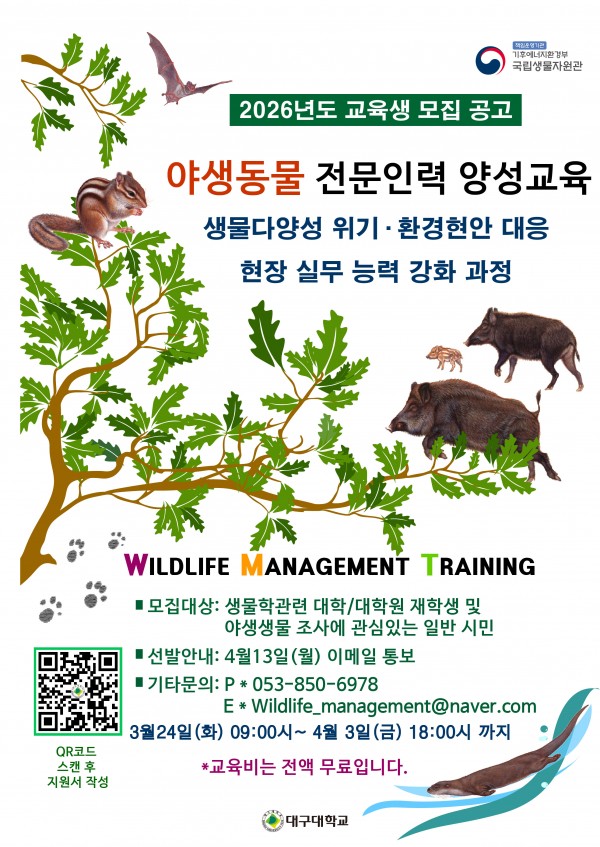 대구대학교 산학협력단에서는 야생동물(포유류) 관리·연구 분야 전문인력 양성을 위해